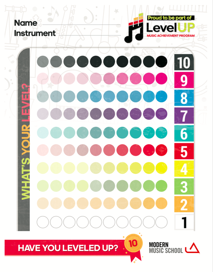 Think about the martial arts Black Belt program… but for music lessons! Level Up is 10 levels of achievement, each with 10 songs and challenges customized by your music instructor for your unique needs and goals – a perfect blend of structure and flexibility. Enjoy following a roadmap of exactly 100 steps from beginning to mastery, earning fun rewards like wristbands and certificates along the way. Level Up was designed for every age, level, and instrument, including adults, brand new beginners, and students who have already had lessons.