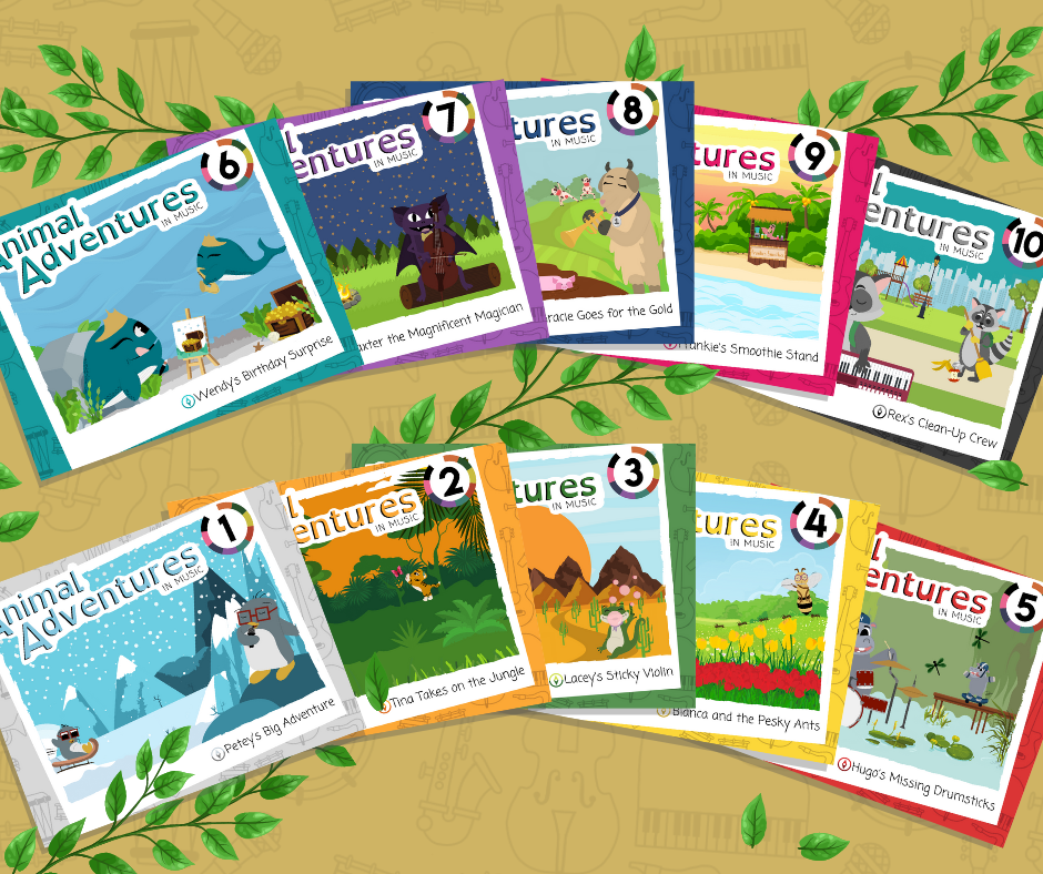 This program covers 10 instruments throughout a series of 10 levels. Throughout this exciting program, your child will travel through 10 themed books with their teacher, exploring a different instrument in each. Every book is filled to the brim with learning activities, games, stickers and more and easily divides the program into 10 extremely structured levels, each of which builds off the previous. As your child completes each level, they will receive a special themed medal featuring the color and animal character from that level.